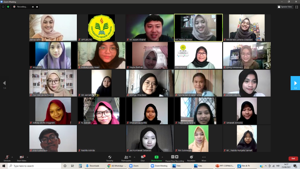 UPT-LBK UNJ telah menyelenggarakan kegiatan webinar dengan tema “Mengelola Stress selama Pembelajaran Jarak Jauh”. Kegiatan ini dilaksanakan secara daring melalui platform zoom meeting pada hari Rabu, 25 Agustus 2021, Pukul 13.00 – 15.00 WIB. Webinar ini diikuti oleh 79 peserta yang terdiri dari mahasiswa UNJ dan masyarakat umum lainnya.